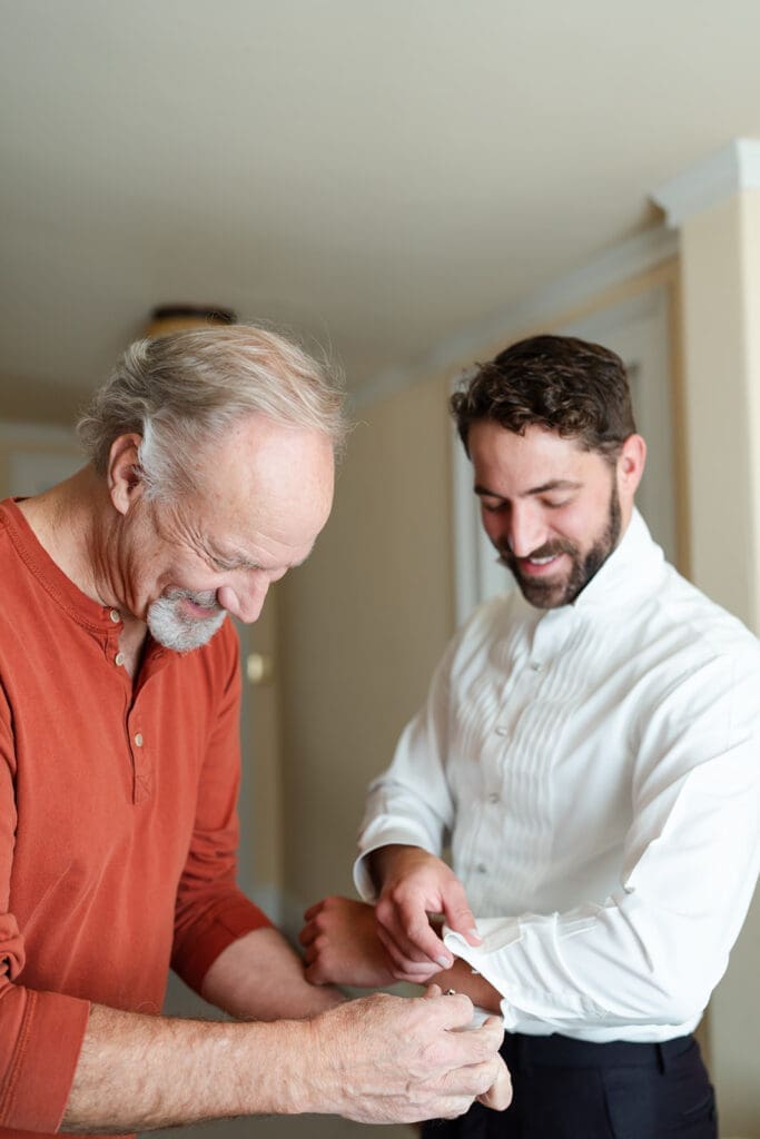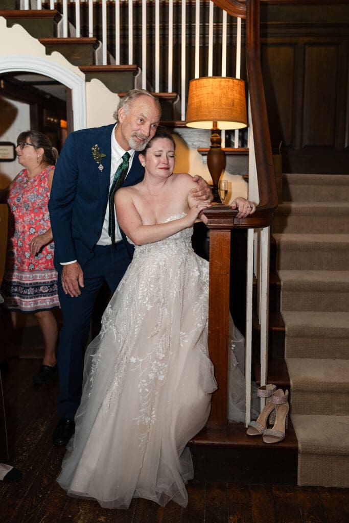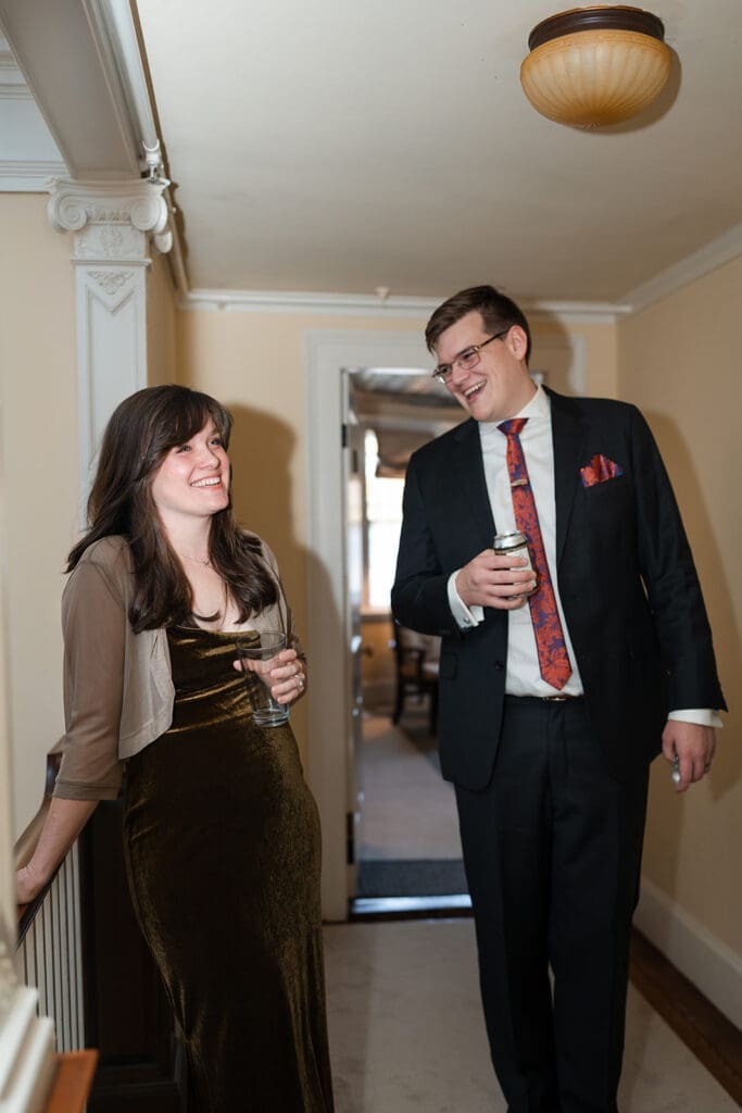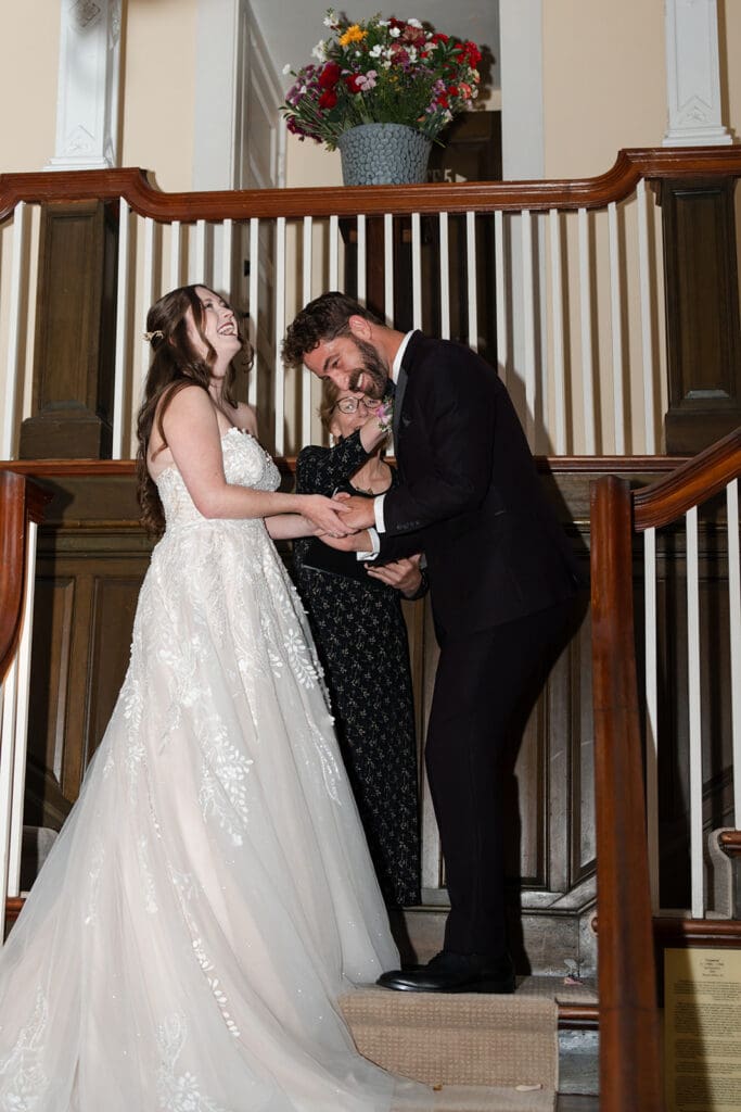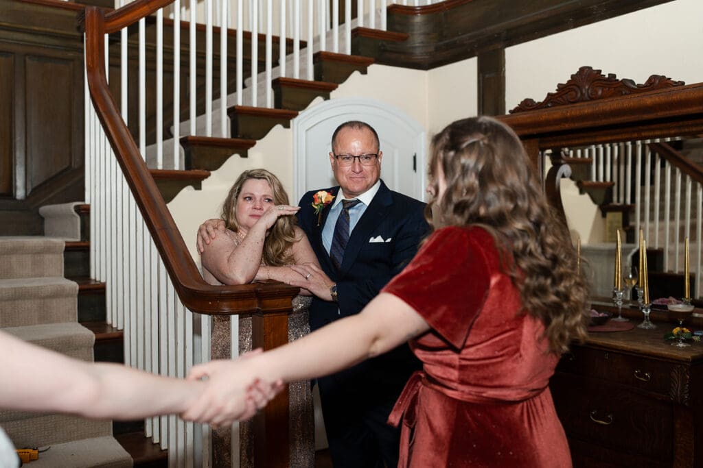 Read on to get a glimpse into this couple’s day, from getting ready with all their guests, to a sweet staircase ceremony, to a reception filled with toasts, joy, and dancing!
