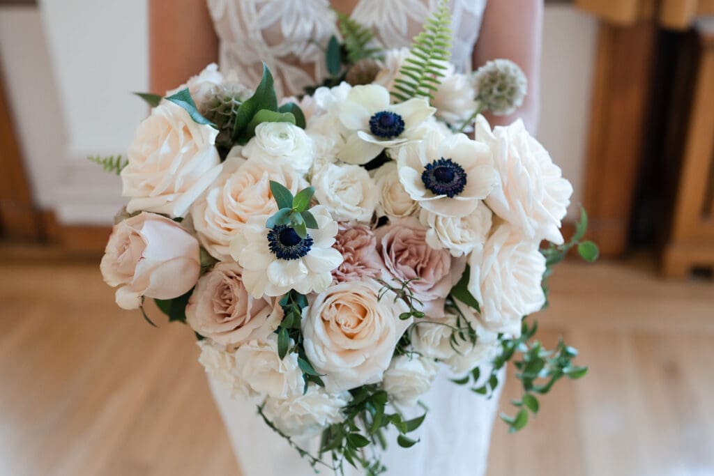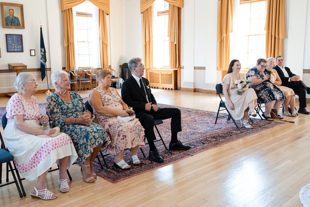 The couple had an intimate wedding ceremony in the State of Maine Room at Portland City Hall. Floral arrangements from Harmon’s Floral Company in their wedding colors added a personal touch to the space. Walking down the aisle in front of their guests didn’t feel natural to Erin and Dylan, so they opted to start the ceremony already standing in front of everyone. A city hall officiant performed the short and sweet ceremony which we followed with family photos. One of my favorite things about small celebrations is that we can get photos with you and each of your guests, whether they’re posed or candid.