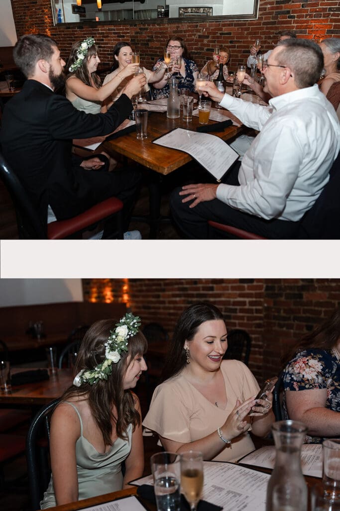 Erin and Dylan had a heartfelt celebration at David’s Restaurant with their elopement guests. Toasts and laughs were shared over delicious food. A few months later, they had a bigger cocktail party with family from farther away in the Portland Old Port at Boone’s Fish and Oyster House. This is a great way to keep your wedding small and intimate, while still getting to include more people in this big life milestone.